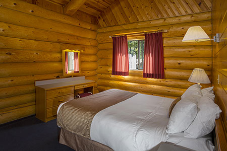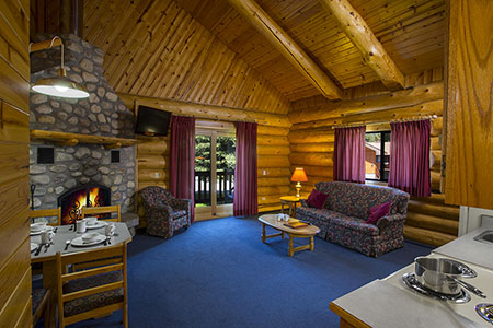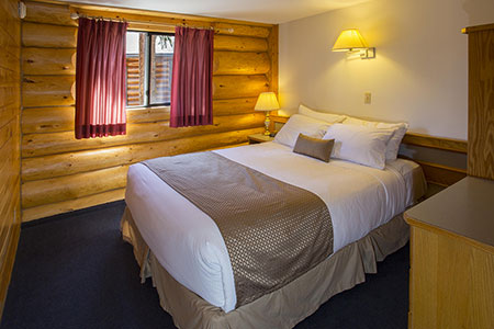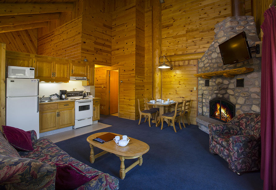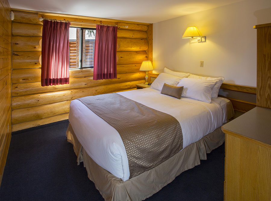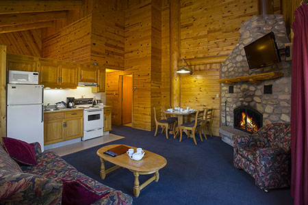 Without Loft for 4:  In duplex log building; two bedrooms with one queen size bed in each, full kitchen, one full bathroom, living room with stone wood burning fireplace and balcony.
