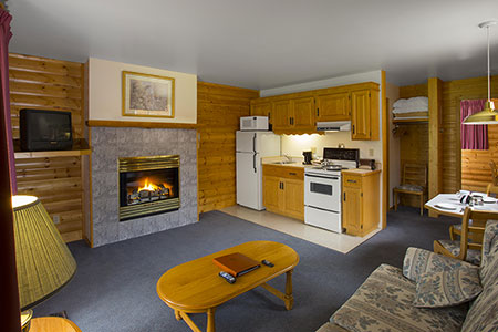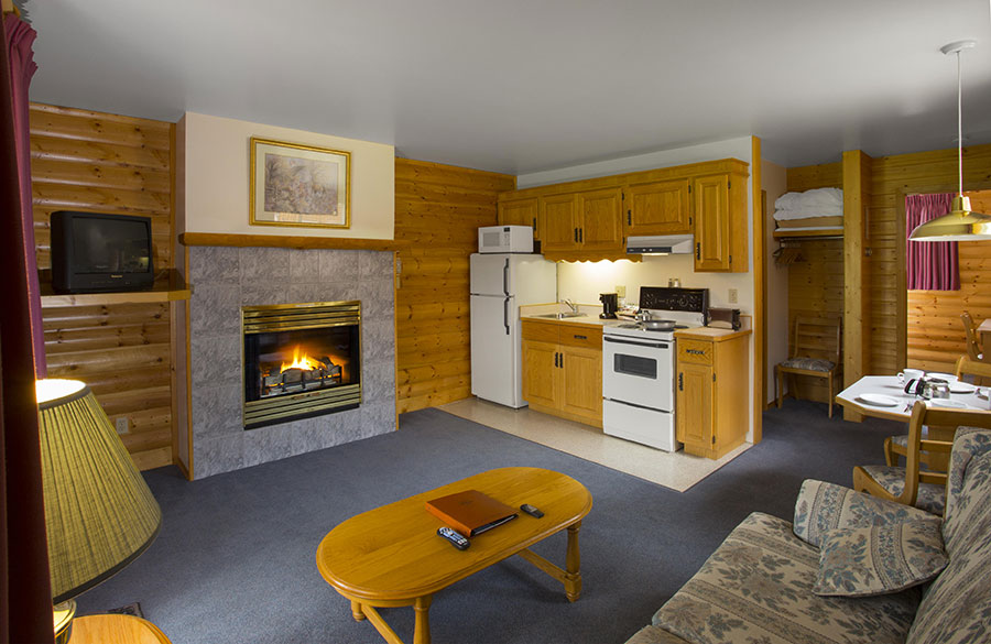 Located in a 4-plex building, each unit has one bedroom with one queen size bed, full kitchen, full bathroom, living room with fireplace. On the lower level with patio.